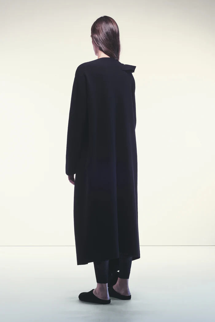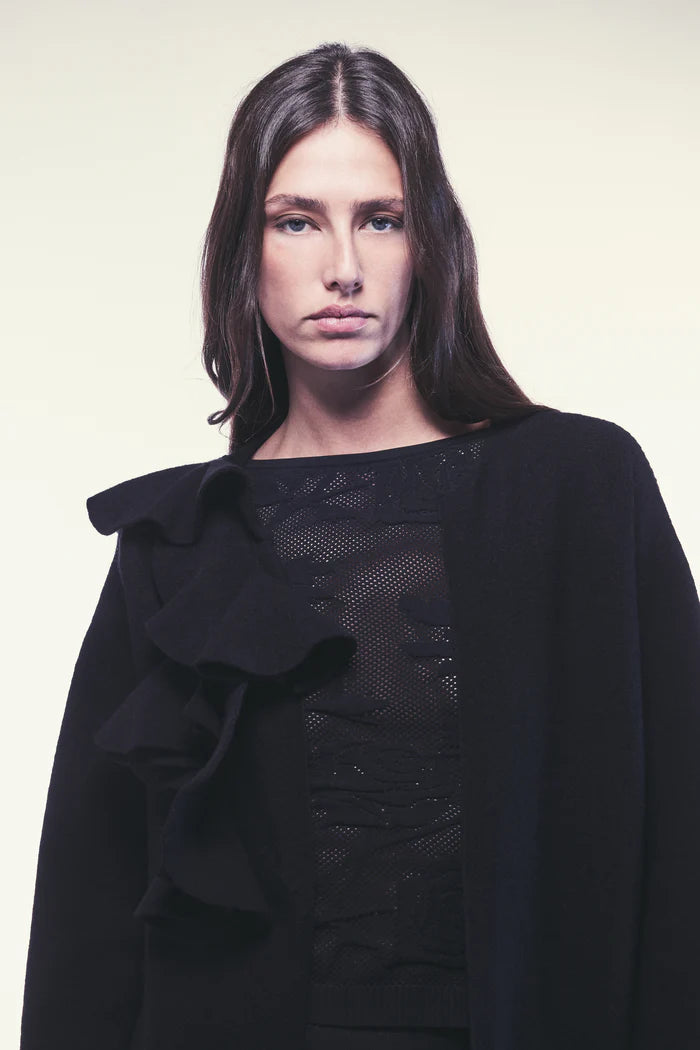 Cardigan lungo in lana infeltrita con dettaglio in volant architettonico sul lato destro che si estende fino al fondo del capo