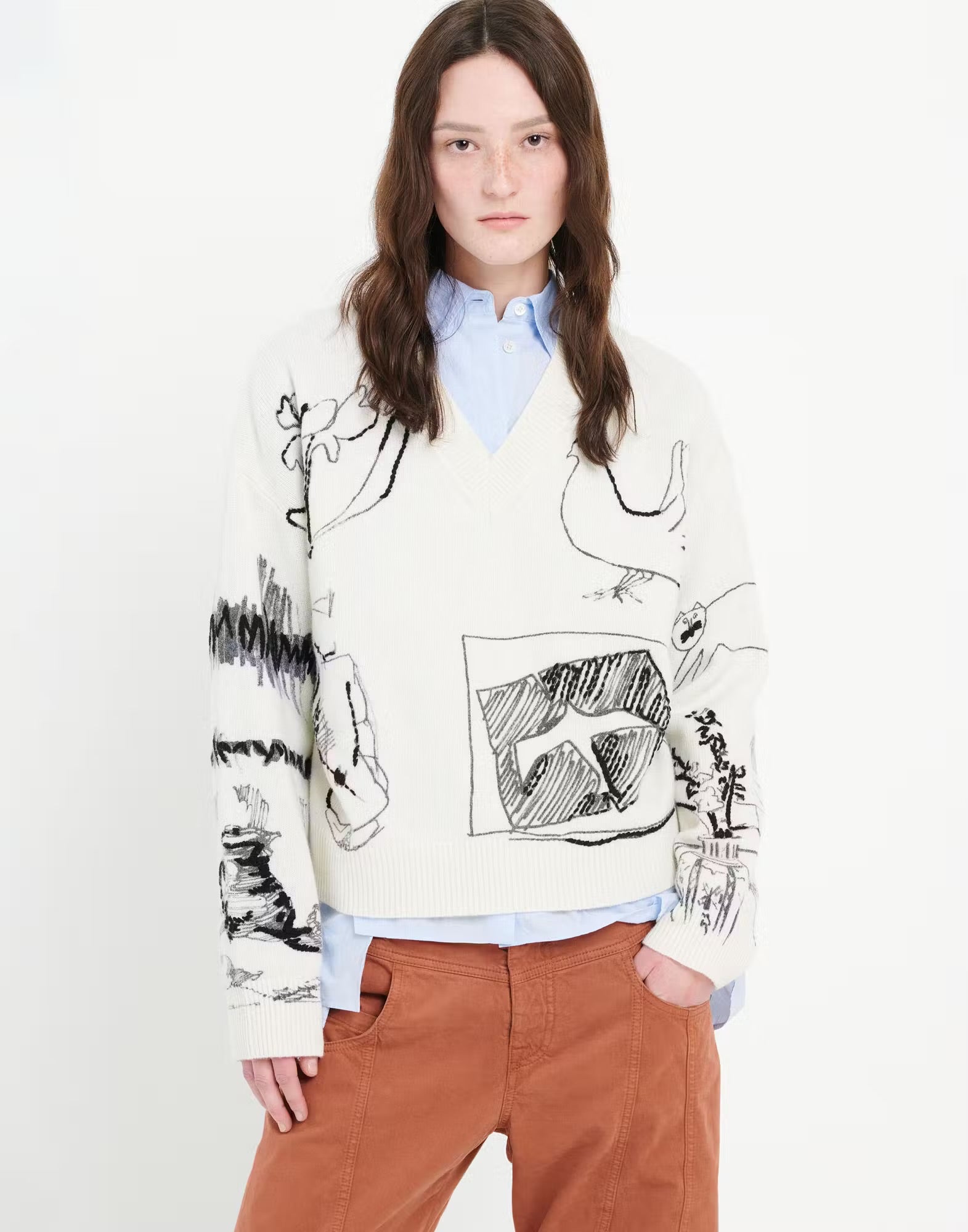 Maglia scollo a V bordato a costine con disegni stilizzati