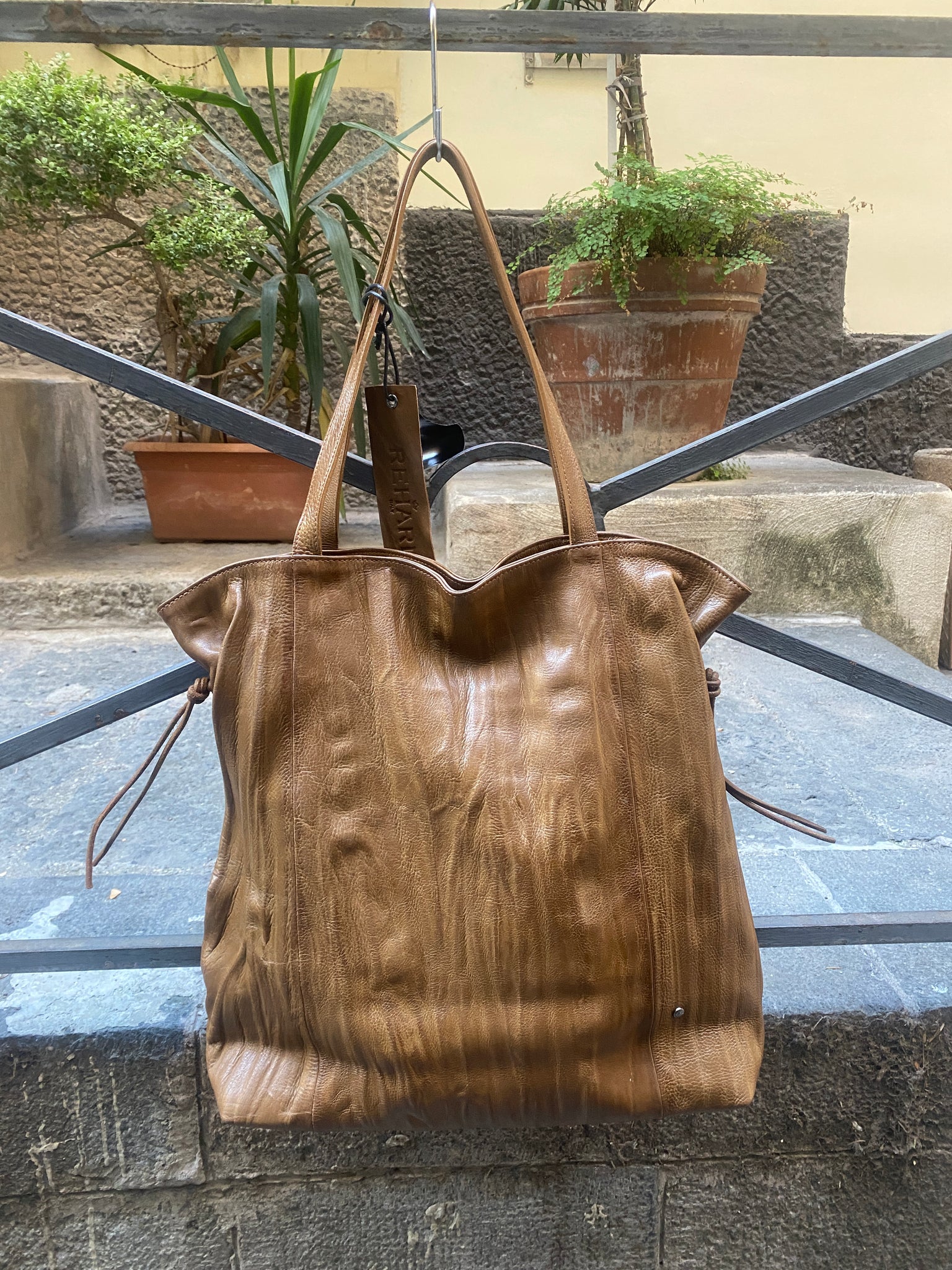 Shopper in pelle con stringhe laterali che regolano l'ampiezza della borsa